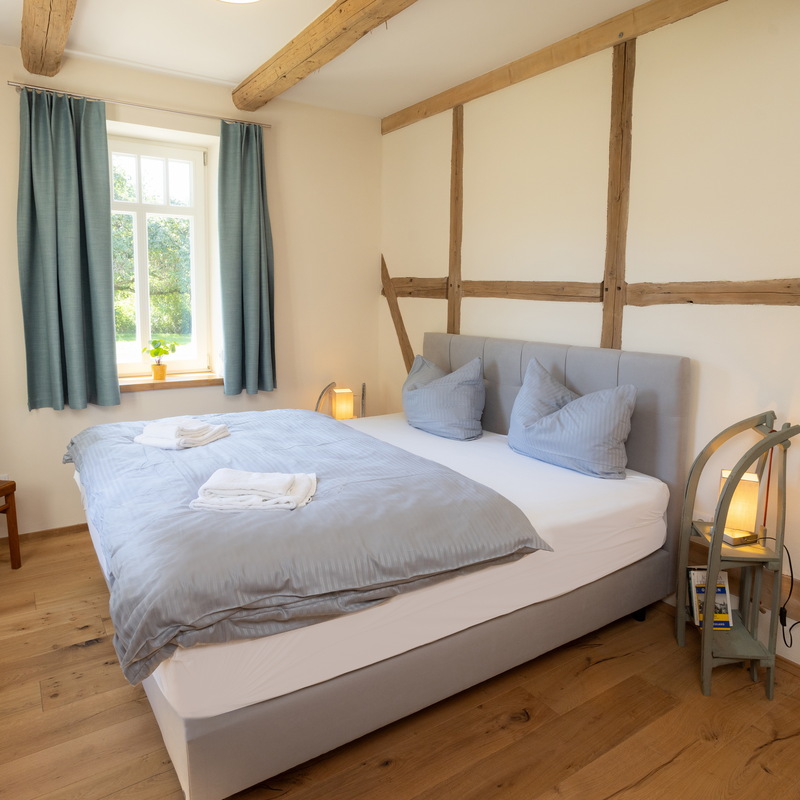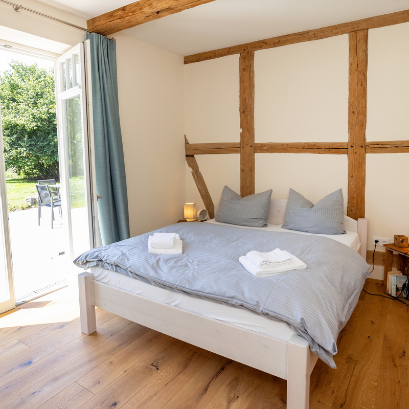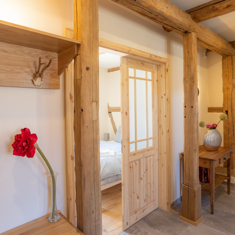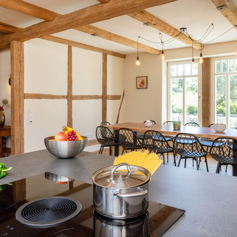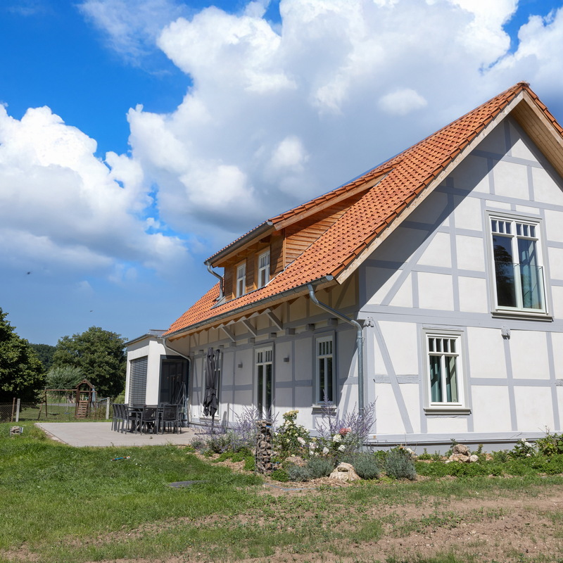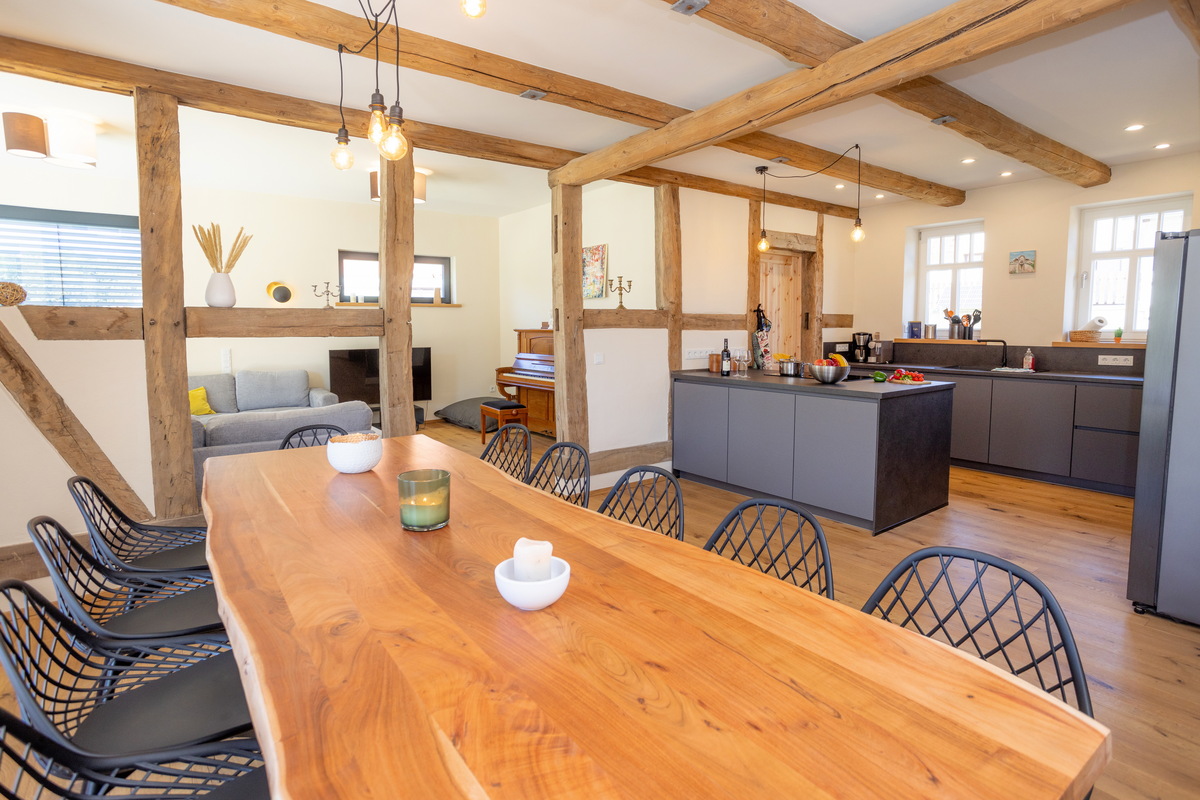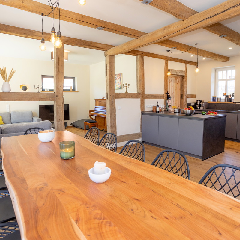 Das großzügige Fachwerkhaus bietet euch alles, was einen gelungenen Aufenthalt ausmacht: 7 individuell eingerichtete Schlafzimmer für bis zu 17 Personen, zwei moderne Badezimmer – eines davon mit freistehender Badewanne , zwei Gäste-WC – sowie ein großes Wohnzimmer mit Sofaecke, Klavier und viel Platz für gesellige Abende. WLAN, TV und modernste nachhaltige Heiztechnik sorgen dafür, dass ihr euch bei jedem Wetter wohlfühlt.