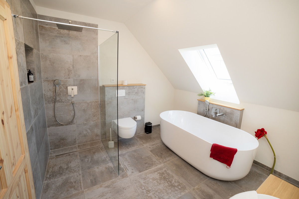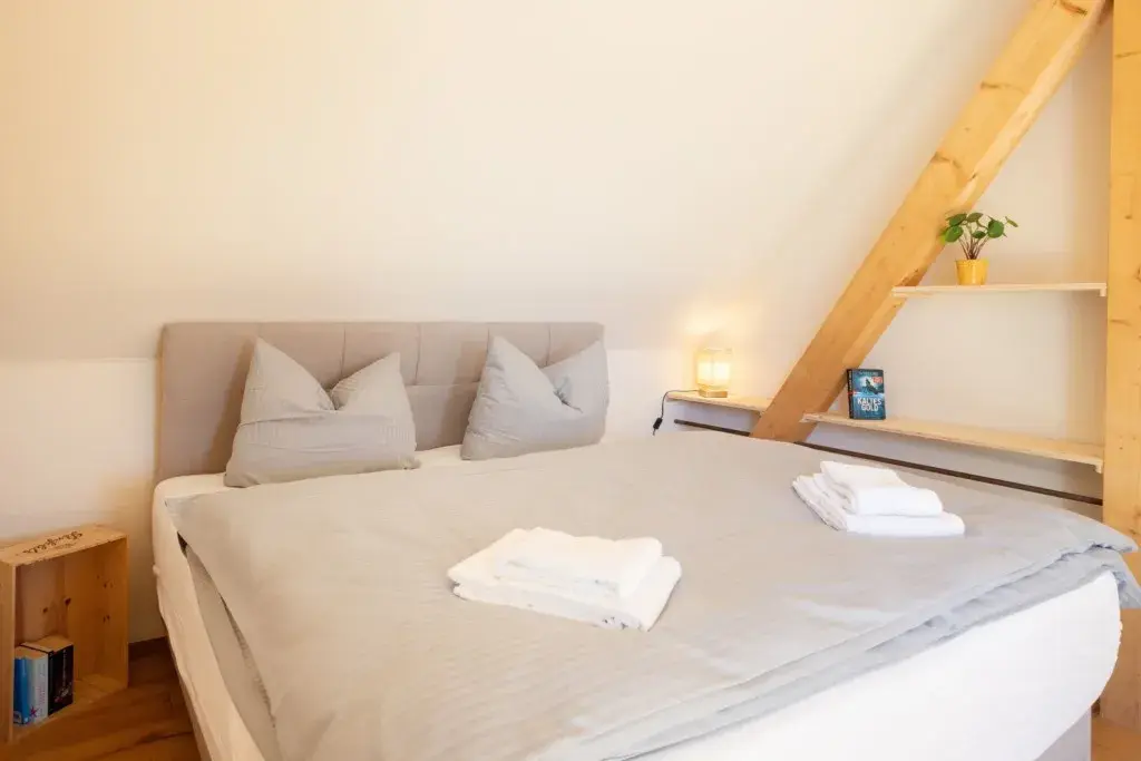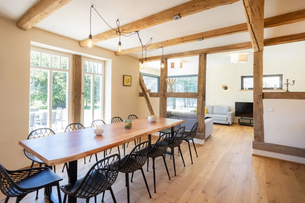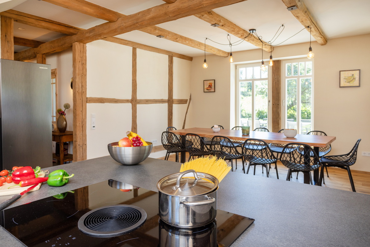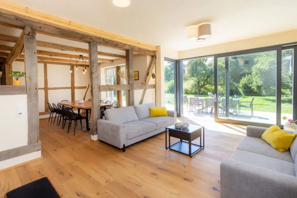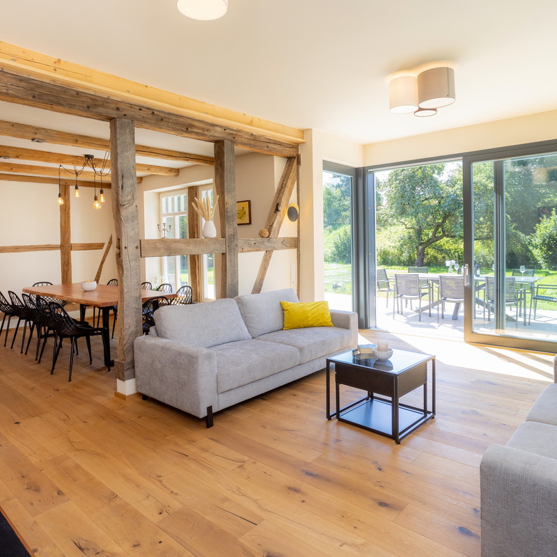 Das großzügige Fachwerkhaus bietet euch alles, was einen gelungenen Aufenthalt ausmacht: 7 individuell eingerichtete Schlafzimmer für bis zu 17 Personen, zwei moderne Badezimmer – eines davon mit freistehender Badewanne , zwei Gäste-WC – sowie ein großes Wohnzimmer mit Sofaecke, Klavier und viel Platz für gesellige Abende. WLAN, TV und modernste nachhaltige Heiztechnik sorgen dafür, dass ihr euch bei jedem Wetter wohlfühlt.