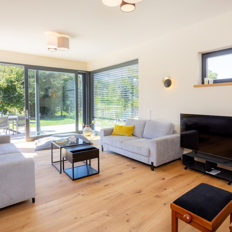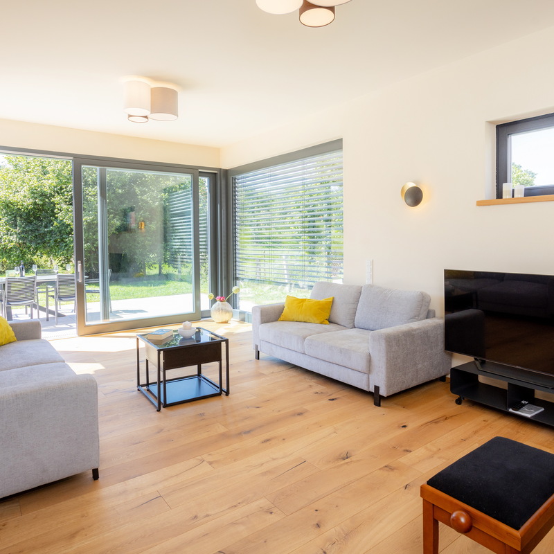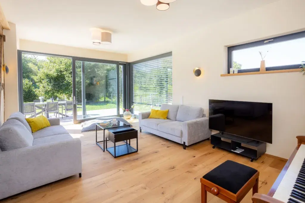 Im Inneren erwarten euch 7 individuell eingerichtete Schlafzimmer für bis zu 17 Personen. Zwei Gäste-WC, zwei moderne Badezimmer sorgen für Komfort – eines mit Dusche, das andere mit zusätzlicher freistehender Wanne. Herzstück ist das große Wohnzimmer mit Sofaecke, Klavier und Platz für gesellige Abende. WLAN, TV und Fußbodenheizung sind selbstverständlich. Die Küche ist voll ausgestattet – vom Herd bis zum Kühlschrank mit Ice-Maker ist alles da.